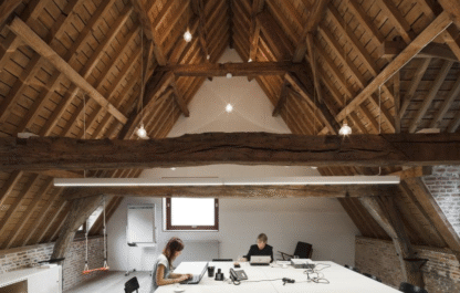De luchtdichtheid van deze schil verbeteren was een uitdaging aangezien onder andere het houten schalieberd en het oorspronkelijke dakgebinte zichtbaar moesten blijven. Dit werd opgelost door zorgvuldige detaillering van de plaatsing van het luchtscherm.