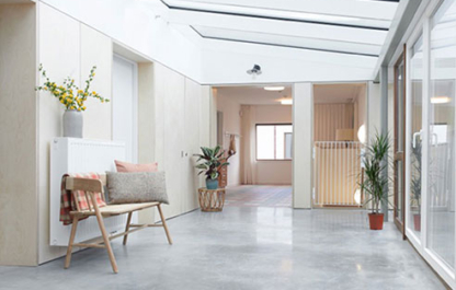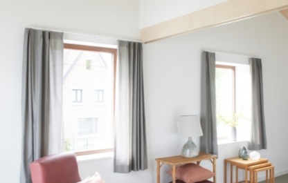 - Akoestisch comfort: Dementerenden zijn gevoelig voor geluidsoverlast. Wij hebben geadviseerd over geluidisolatie tussen kamers en een beperkte nagalmtijd in gemeenschappelijke ruimtes. Kamers geven rechtstreeks uit op de leefruimte. Schuifpanelen maken het mogelijk om een extra sas te creëren, voor een betere geluidsafscherming.