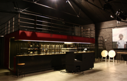 Het beschikbare budget vroeg om zeer economische ingrepen. Het akoestisch concept bestaat uit enkele eenvoudige en doeltreffende ingrepen. De geluidisolatie van de bestaande loods wordt verbeterd door het verzwaren van het dak met betontegels. Dit bestaande volume wordt overkapt met een eenvoudige betonnen stolp. Inwendig is het volume akoestisch in twee delen gesplitst, met de koude drankenberging als buffer tussen de concertzaal en het café.